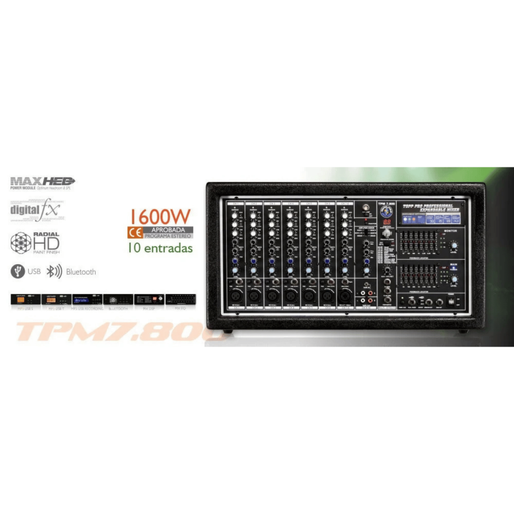 مكسر الصوت TPM7.800 من ماركة توب برو هو جهاز صوتي متقدم يجمع بين القوة والمرونة بقدرة إجمالية تصل إلى 1600 واط (800 واط لكل قناة). هذا المكسر الاحترافي مصمم خصيصًا لتلبية احتياجات الأنظمة الصوتية في المساجد، الجوامع، القاعات، والفعاليات الكبيرة التي تتطلب توزيع صوتي قوي ودقيق.