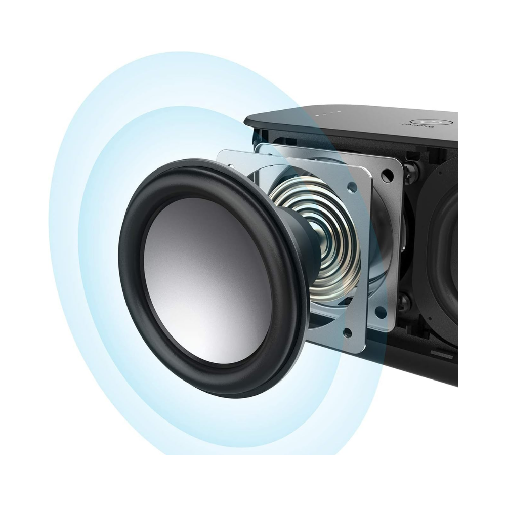 تتميز السماعة بمكبرات صوت مزدوجة وصبووفر مدمج لإنتاج صوت استريو نقي وقوي يصل إلى 20 واط، مما يجعلها مثالية للاستماع إلى البودكاست، حفلاتك الخاصة، أو الموسيقى بجميع أنواعها.