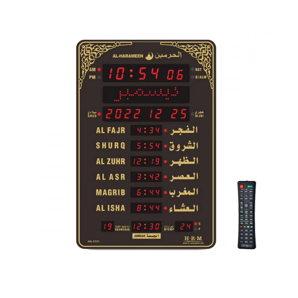 تجمع ساعة الحرمين HA-5151 بين الأذان الكامل والمزايا الذكية الحديثة، مع دعم لغتين وشاشة رقمية مضيئة بالكامل. صُممت لتكون خيارًا مثاليًا للمنازل، المكاتب، والمساجد.