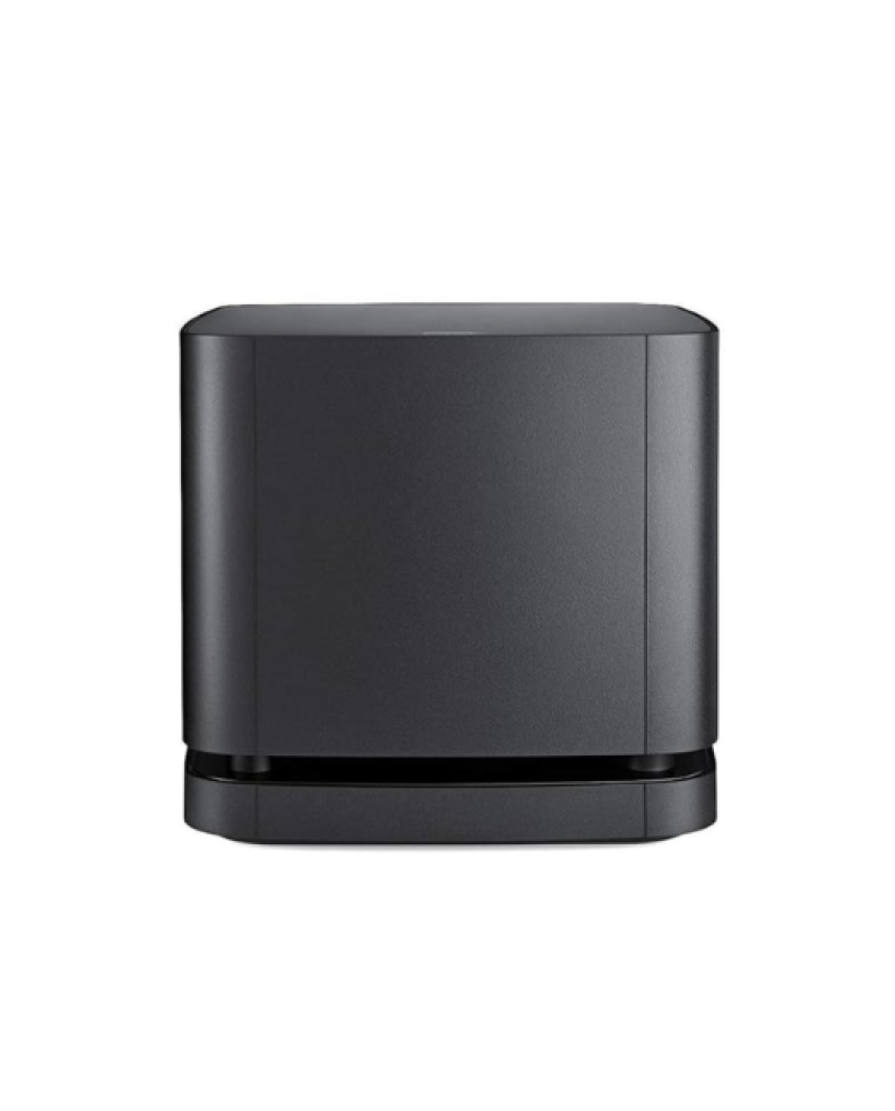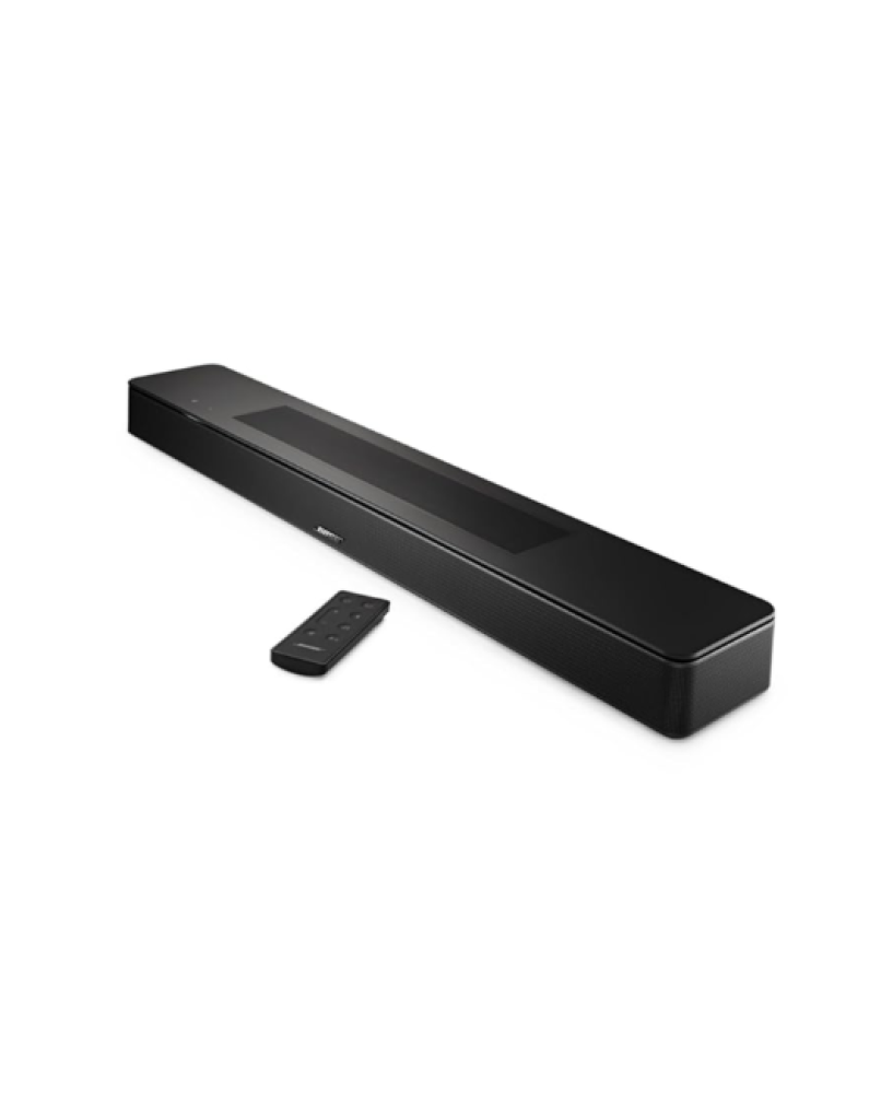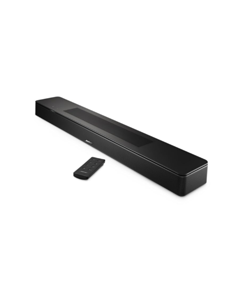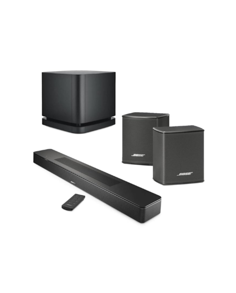 ساوند بار ذكي جديد من Bose بدولبي أتموس، باللون الأسود، مع سماعات محيطية لاسلكية (زوج) وموديل Bass 500