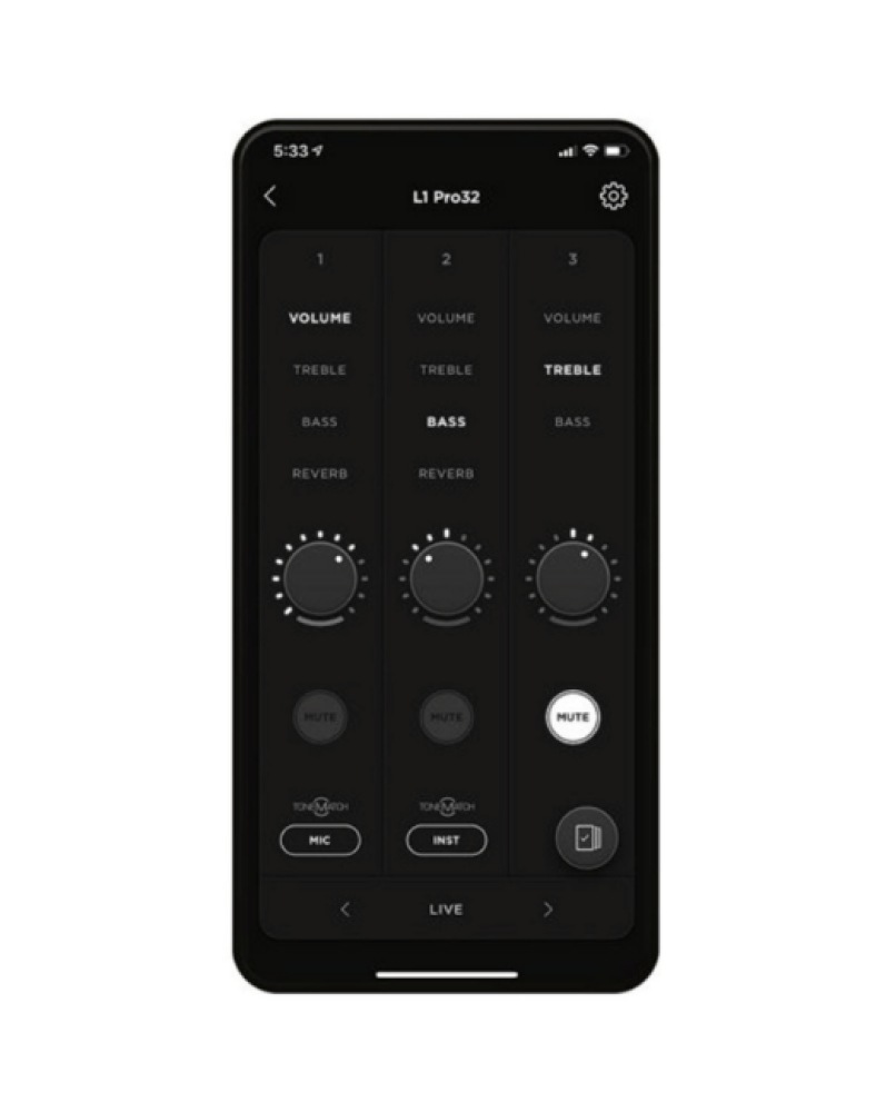 يتضمن L1 Pro16 مضخم صوت وموزع صوت مدمجين، مما يسمح لك بضبط الصوت بسهولة عبر تطبيق Bose Music على هاتفك الذكي.