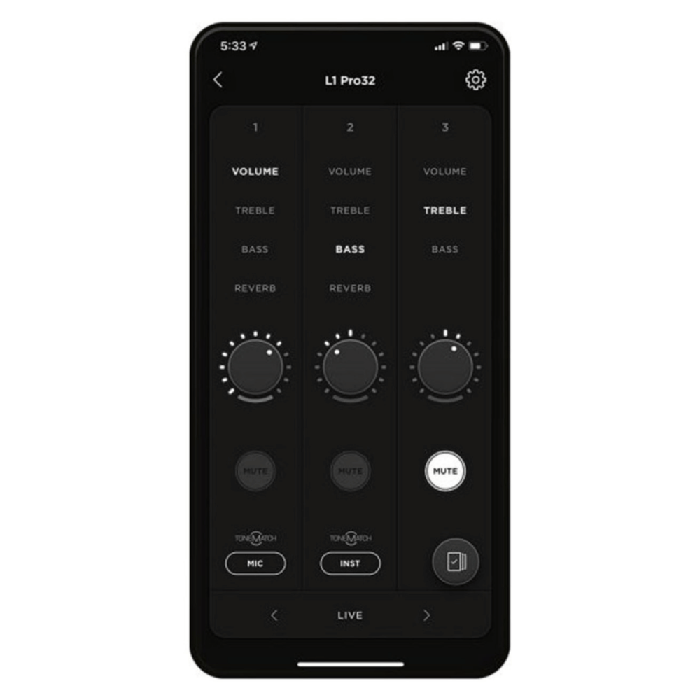 يتضمن L1 Pro16 مضخم صوت وموزع صوت مدمجين، مما يسمح لك بضبط الصوت بسهولة عبر تطبيق Bose Music على هاتفك الذكي.
