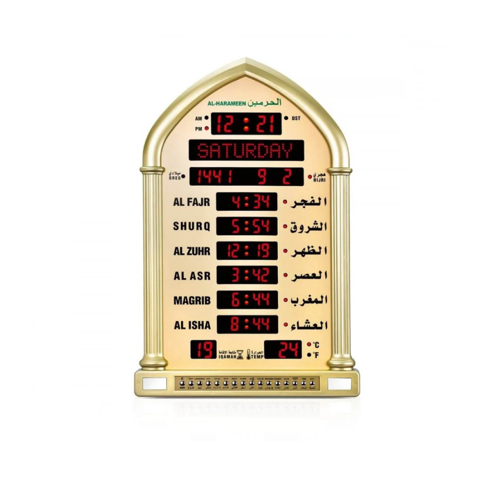 ساعة الحرمين HA-5118 مصممة لتناسب البيوت، المكاتب، الصالات، والمساجد، حيث توفر الأذان الكامل لمواقيت الصلاة مع شاشة رقمية واضحة وإمكانية التحكم الكامل عبر الريموت.