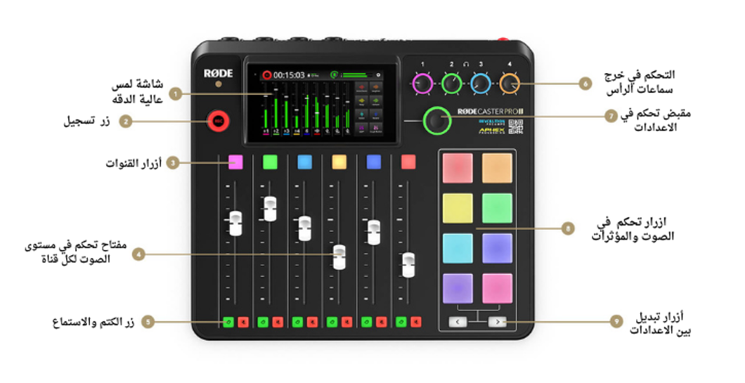 - الـ faders الموجودة ستسهل عليك التحكم في المايكروفونات المتصلة بشكل اسرع واسهل واكثر دقة