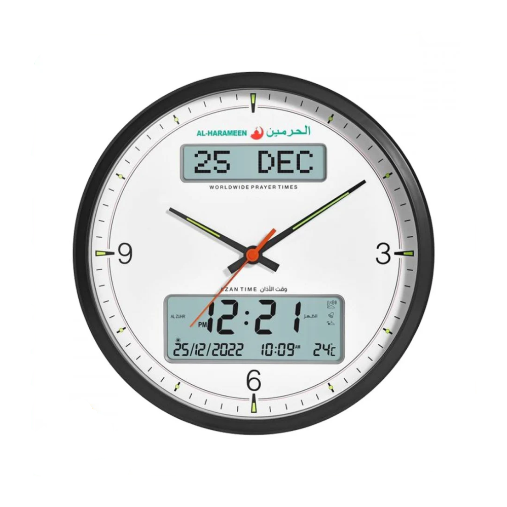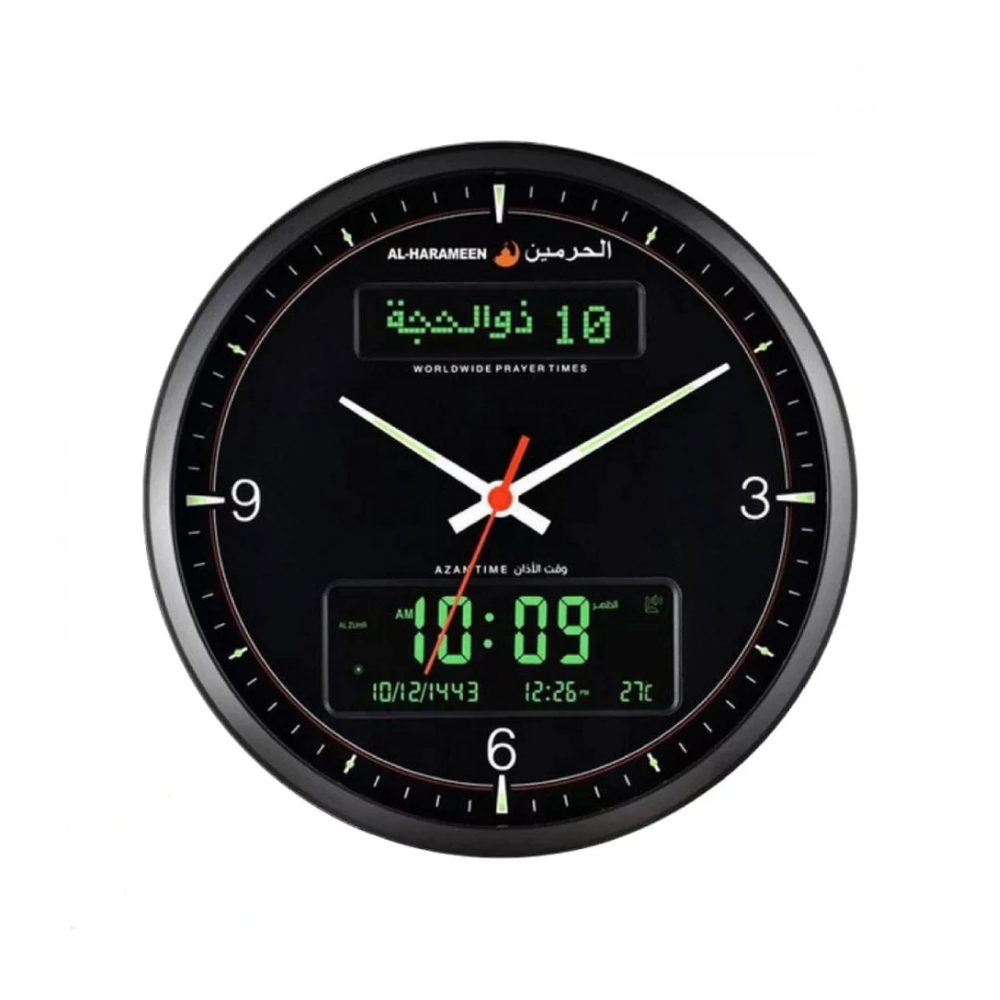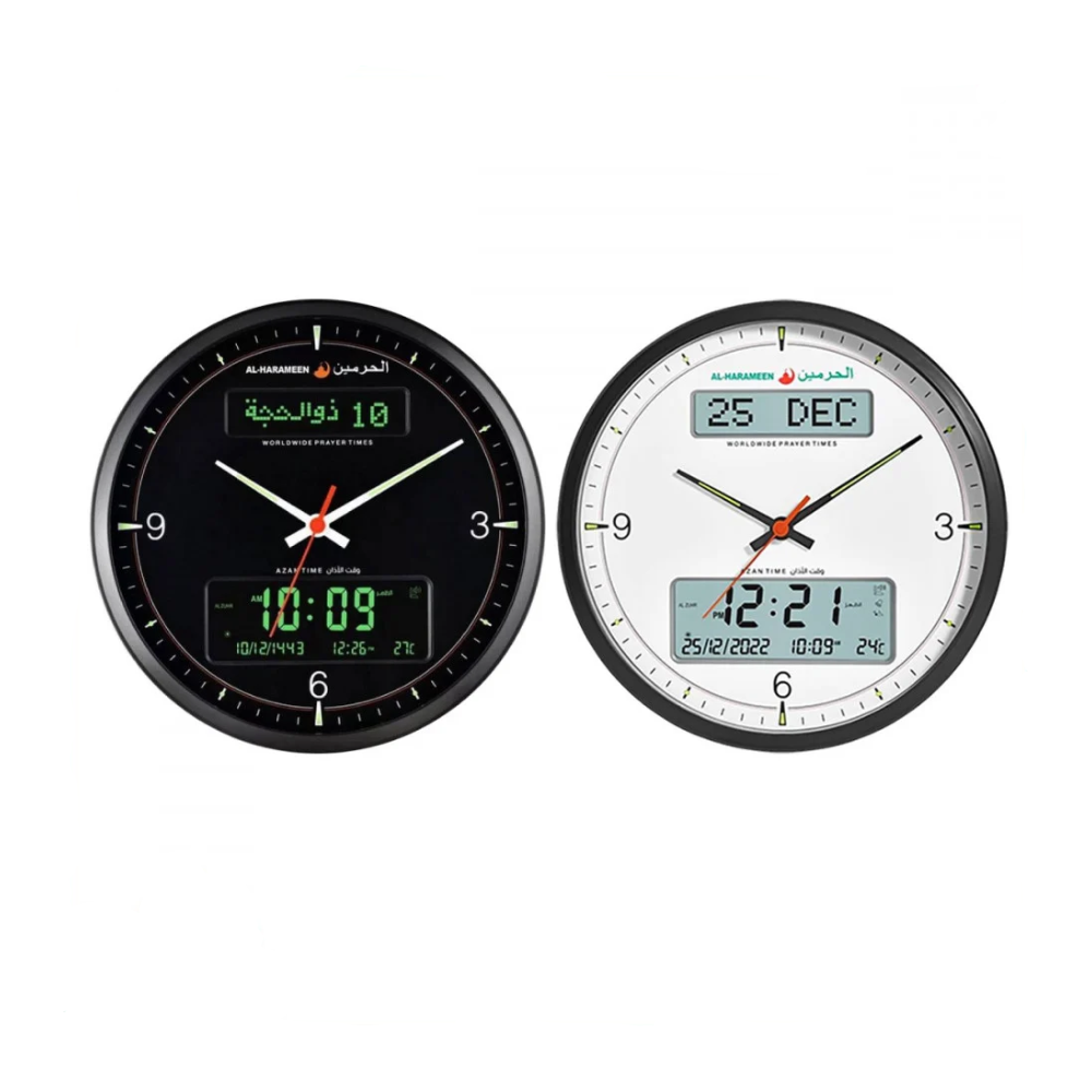 تجمع ساعة الحرمين HA-7054 بين التصميم الكلاسيكي بالعقارب والتقنيات الحديثة بالشاشتين الرقميتين، لتوفر دقة عالية ووضوحًا في عرض الوقت مع مميزات الأذان الكامل. مناسبة للمنازل، المكاتب، المساجد والصالات.