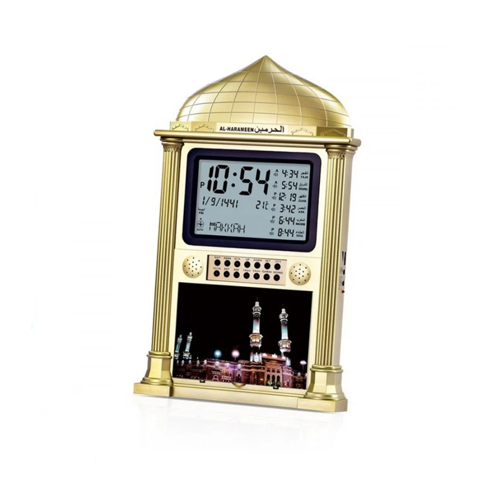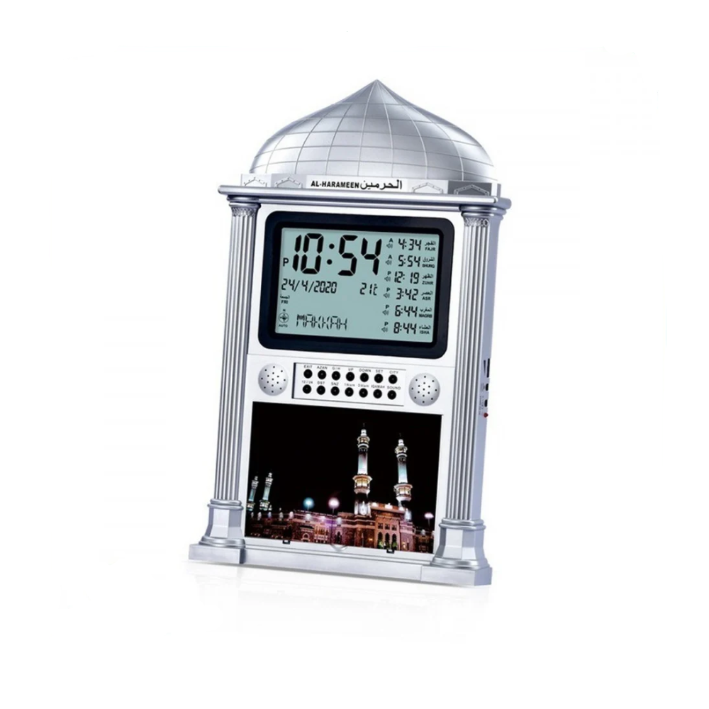 ساعة الحرمين HA-4002 تتميز بشاشة عريضة وواضحة لعرض أوقات الصلوات مع مزايا عملية مثل مخرج AUX، وإمكانية التحكم الكامل بالأذان والمنبهات، لتكون خيارًا مثاليًا يجمع بين الأناقة والوظائف الذكية.