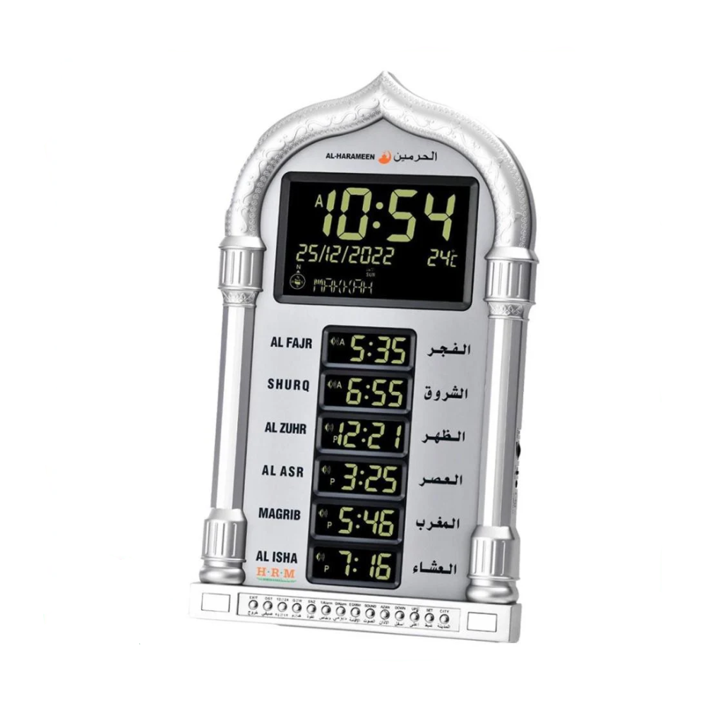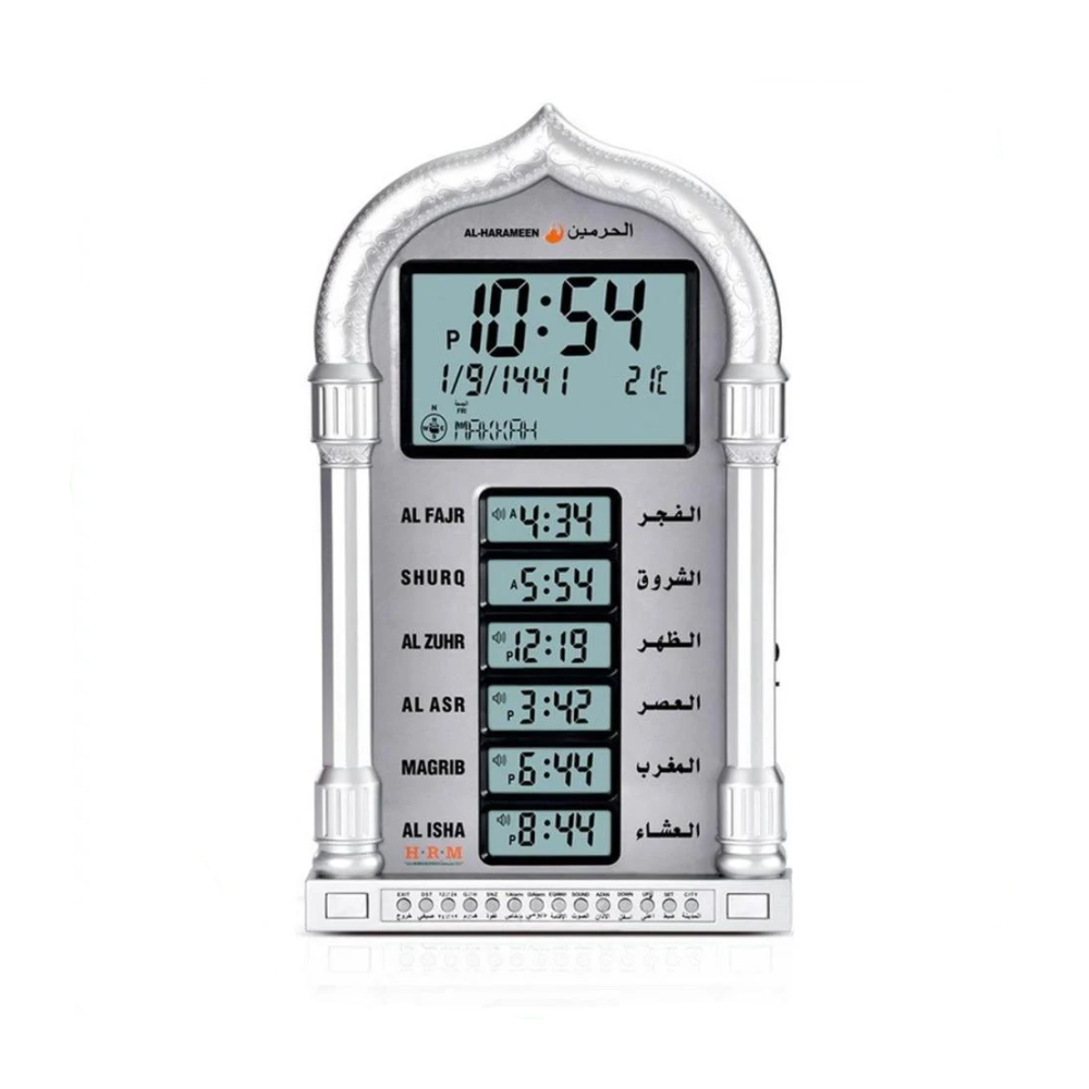 ساعة الحرمين HA-4028 تجمع بين التصميم العصري والمميزات الإسلامية الذكية، لتمنحك عرضًا واضحًا لأوقات الصلاة مع خيارات متعددة تناسب البيت، المكتب أو المسجد.